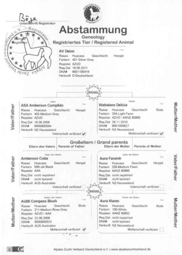 Deckhengst AV Deion hat die Zuchteignungsprüfung beim AZVD mit 99 Punkten Kategorie A bestanden! 50 Punkte für Phänotyp / 49 Punkte für die Faser |